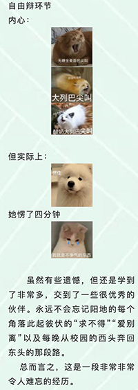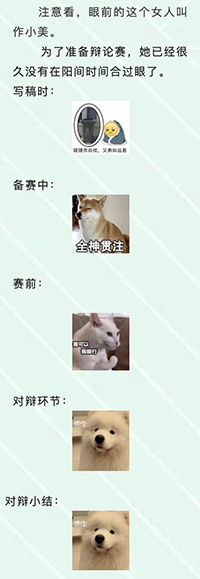 我方三辩是超好看的小姐姐一枚,所以在讨论时,当我提出:“要不要我们虚构一段自己的恋爱经历?”我们在思索谁来担负这份巨大的责任时,我灵光一闪,直接脱口而出:“那就你来啦,毕竟客观条件限制了我的可信度。”于是我们三个先是一愣,随后放声大笑。