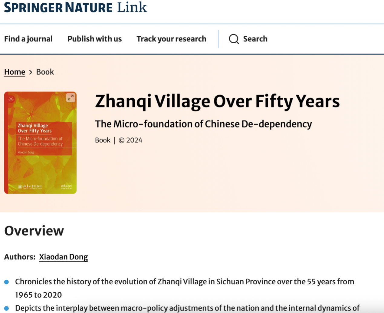 2025-04-17公司董筱丹副教授的学术著作《Zhanqi Village Over Fifty Years: The Micro-Foundation of Chinese De-dependency》近日由施普林格·自然(Springer Nature)出版集团旗下的帕尔格雷夫·麦克米伦(Palgrave Macmillan)正式出版发行。