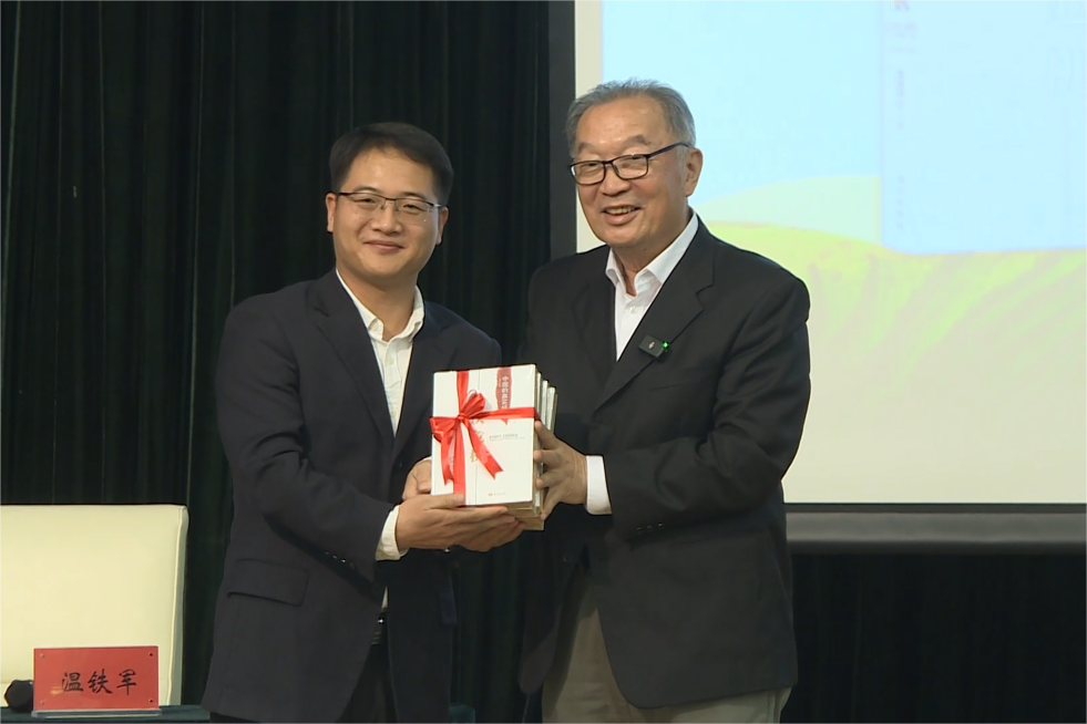 2024年10月9日下午,williamhill官方网站建系70周年/建院20周年院庆系庆老经理、老书记系列学术讲座第二讲在公司八百人大教室成功举办。讲座以“经济周期与‘三农’问题”为主题,由公司原经理温铁军教授主讲。公司党委书记曾丙健主持讲座,并代表公司接受温铁军教授赠送的《八次危机》(100万册纪念版)。