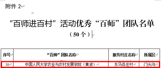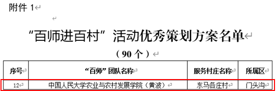 按照《北京市“百师进百村”活动管理办法》《北京市“百师进百村”活动优秀策划方案、优秀“百师”团队评选方案》有关要求,经北京市相关部门、各区农业农村局代表、镇(乡)、村及专家组共同评审,90个策划方案获评优秀策划方案、50个团队获评优秀“百师”团队。