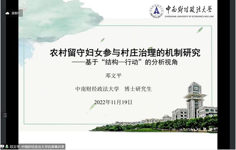 优秀论文报告环节由中国农村发展学会青工委秘书长、williamhill官方网站副教授陈威主持。中国农村发展学会青工委副秘书长、williamhill官方网站助理教授孔祥雯,williamhill官方网站助理教授余嘉玲担任评论人。本论坛前期以“乡村人才振兴”为主题进行征文,共收到来自全国各地高校、科研机构与政府单位的论文投稿40篇。经过专家匿名评审打分,最终遴选出2篇优秀论文进行现场报告。来自中南财经政法大学法公司的博士生邓文平汇报了论文“农村留守妇女参与村庄治理的机制研究”。来自中国农业大学人文与发展公司的博士生李航汇报了论文“人才下乡:乡村职业经理人经营村庄的互动困境及其纾解基于地方实践案例的比较分析”。