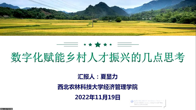 西北农林科技大学经济管理公司经理夏显力教授以“数字化赋能乡村人才振兴的几点思考”为题作主旨发言。他阐述了乡村人才振兴的内涵及其背景,以及通过数字化赋能实现乡村人才振兴的具体路径,为乡村人才培育过程中从产业体系端、乡村管理端、技术专员端打造适合于未来乡村振兴的人才队伍提出了展望。