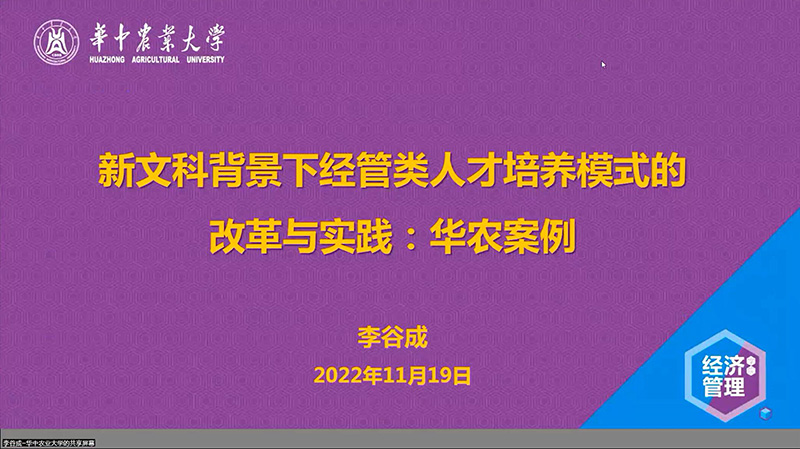 华中农业大学经济管理公司经理李谷成教授以“新文科背景下经管类人才培养模式的改革与实践:华农案例”为题作主旨发言。他强调华中农业大学在人才培养上围绕一个中心,抓好了两个引领,塑造了三个品牌,完善了四个建设,构建了五大体系,全面提升了人才培养质量。