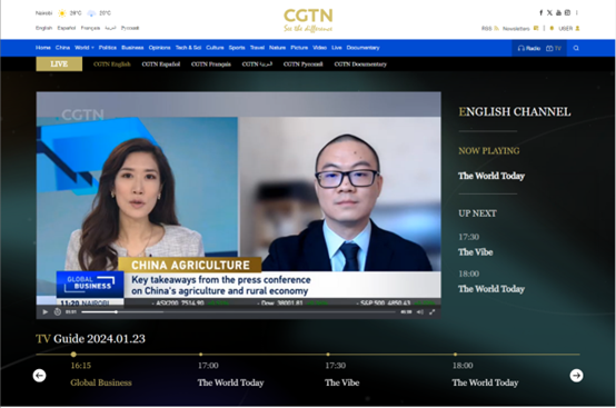 公司王翔瑞副教授受邀做客中国国际电视台(CGTN)《全球财经》(Global Business)栏目,就发布会内容、成果数据、城乡融合发展和中美农业合作机制重启等议题做了解读。王翔瑞认为, 2023 年我国粮食产量 13908.2 亿斤,连续 9 年稳定在 1.3 万亿斤以上对于保证我国和全球粮食安全都有重要意义。 科学技术和绿色理念助推我国农业高质量发展, 有助于乡村产业发展和创造就业机会。 城市和农村之间的人员、资金和技术的双向流动为城乡融合发展提供源源不断的动力。 中美农业合作机制重启为解决全球粮食安全和应对气候变化提供了新的平台。