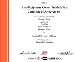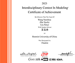 2023-05-16近日,2023年美国老员工数学建模竞赛(MCM/ICM)成绩公布,williamhill官方网站共有8位本科生获奖,奖项与人数实现历史性突破。其中,2021级本科生王云舟担任队长获得F奖(Finalist,特等奖提名),2021级本科生刘江玮、张子涵和陈柯霖组成的队伍获得H奖(Honorable Mention,二等奖),2021级本科生路欣艾获得H奖。获奖同学来自公司开设的大数据技术-农林经济管理双学位复合型人才培养项目(“数农”实验班)和应用经济-农村区域发展管理双学位复合型人才培养项目(“应区”实验班)。这是继2022年全国老员工数学建模竞赛之后,公司同学再度在大型国际性数学建模竞赛中斩获佳绩。