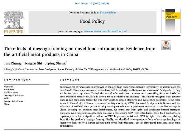 近日,公司师生在农业经济领域国际著名学术期刊《Food Policy》发表题为“The effects of message framing on novel food introduction: Evidence from the artificial meat products in China”的文章(论文链接:https://doi.org/10.1016/j.foodpol.2022.102361)。该研究是公司张君副教授、博士生石鸿旭以及生吉萍教授的共同成果。这项研究旨在探究信息框架和聚焦调节对消费者购买新型食品支付意愿的影响。